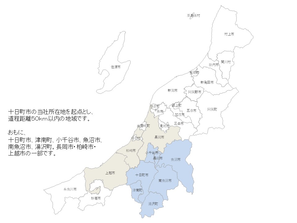 工事対応エリアは、当社所在地を起点とし道程距離50km以内の地域です。おもに