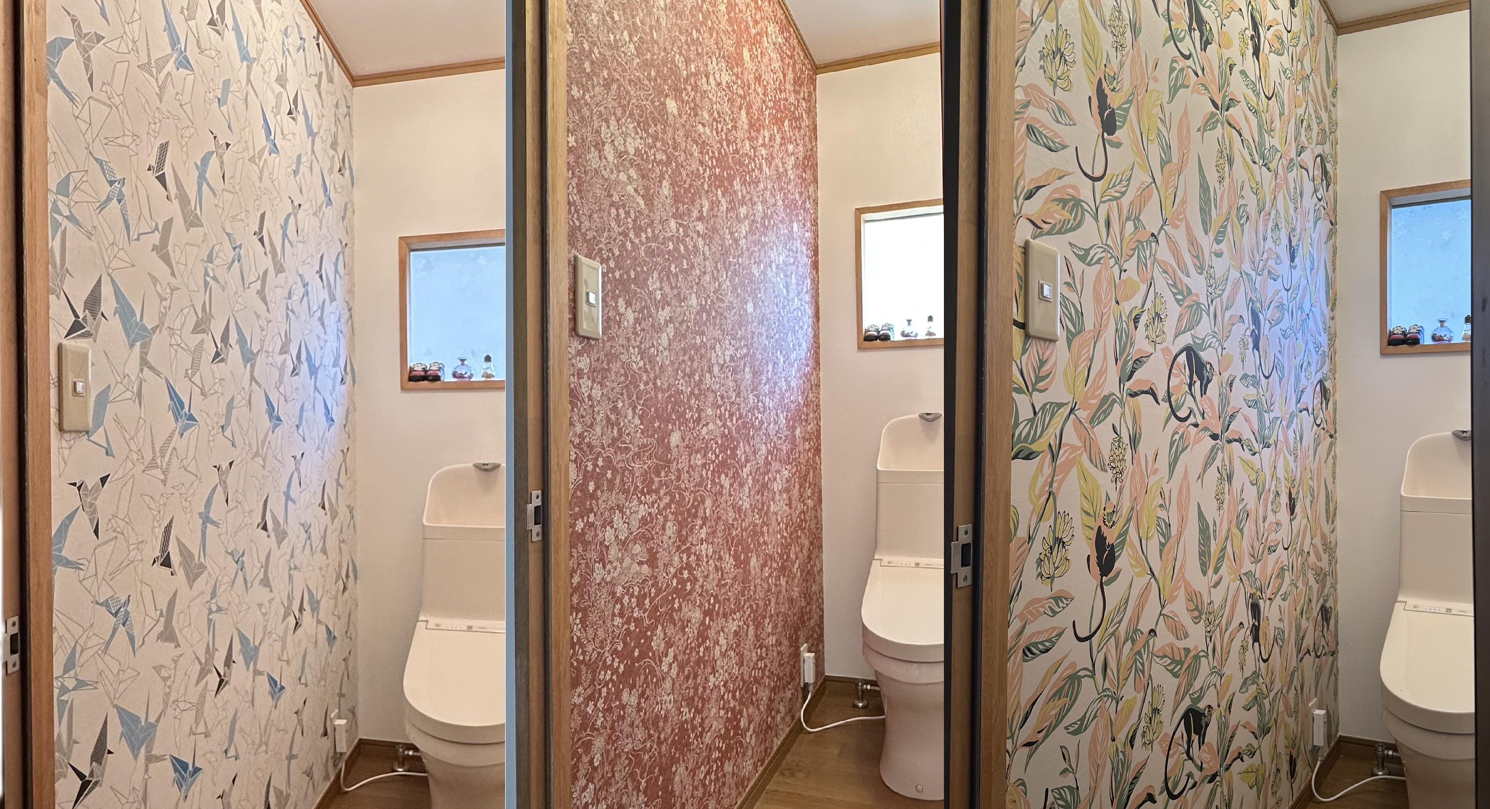 トイレのアクセントクロスのみ貼り替えの小規模リフォーム工事です。短期間に貼り替えをするあまり前例のない工事でした。