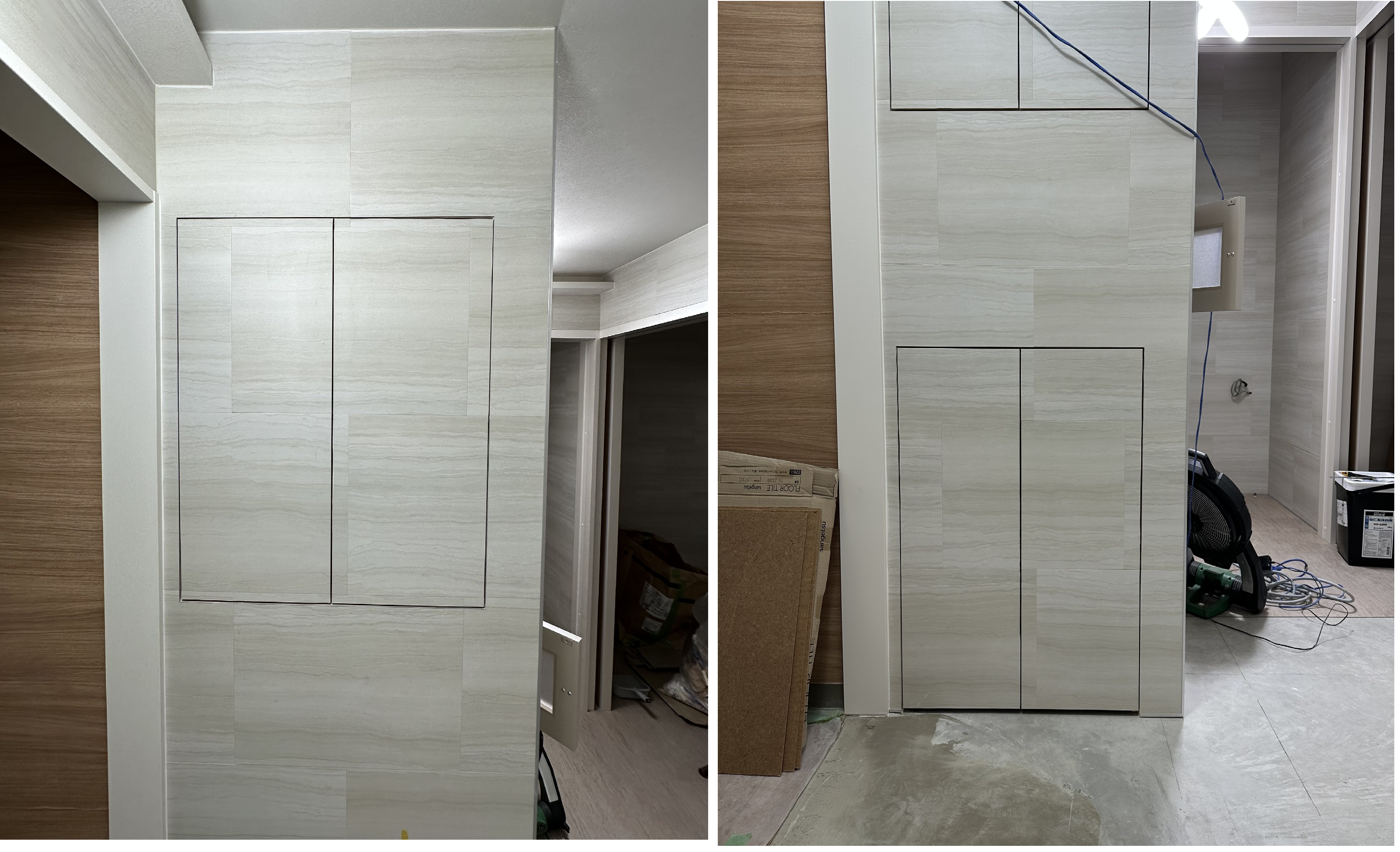 本来、床用の材料であるフロアタイルを壁に貼る工事です。耐久性があり、汚れにも強いフロアタイルは施設などの水廻りでも使われます。施工に手間がかかり、割付など設計段階からの検討が必要なのであまり多用されませんが、壁紙では得られない質感やデザインをつくることもできます。事例では既存の物入れ建具に貼ったため、建具との割付がずれていますが、これはこれで面白い納まりになったと思います。